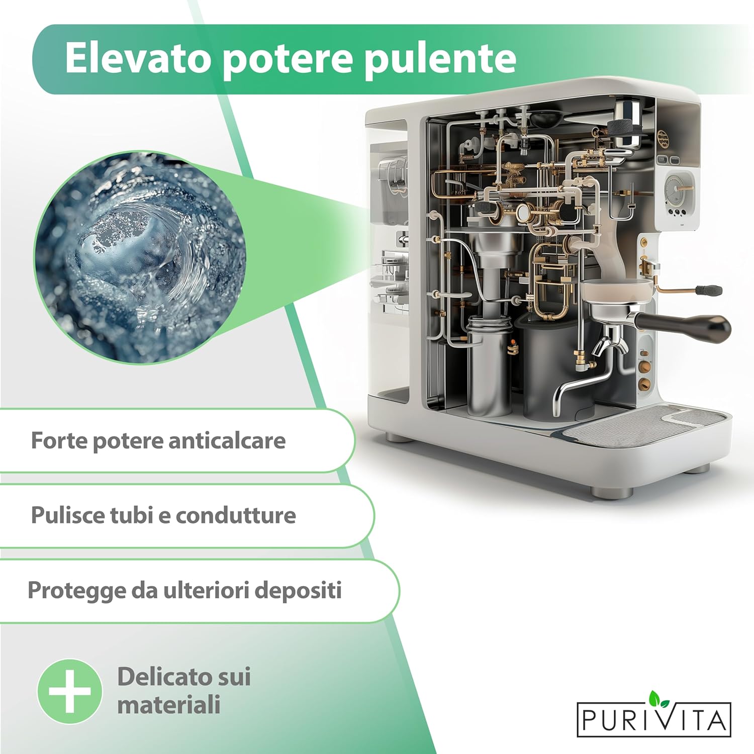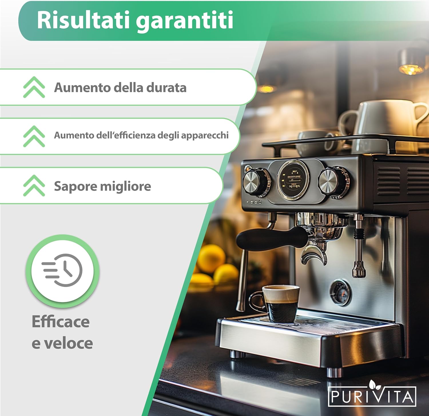 Scegliere il decalcificante PURIVITA® significa fare un investimento consapevole nella qualità della tua esperienza quotidiana con il caffè e nella durata della tua preziosa macchina. Il calcare è il nemico numero uno di qualsiasi elettrodomestico che utilizzi acqua: si accumula silenziosamente nei condotti interni, compromette l'efficienza energetica, altera il sapore delle bevande e, nel tempo, può causare danni irreparabili ai componenti più delicati. Una regolare manutenzione con il nostro decalcificante universale previene tutti questi problemi, mantenendo la tua macchina da caffè in condizioni ottimali anno dopo anno. La differenza tra un caffè preparato con una macchina ben mantenuta e uno proveniente da un apparecchio trascurato è immediatamente percepibile: nel primo caso, potrai apprezzare appieno gli aromi intensi e le sfumature gustative del tuo caffè preferito; nel secondo, noterai sapori alterati, temperature non ottimali e una resa complessiva insoddisfacente. Il decalcificante PURIVITA® ti permette di preservare quella sensazione di caffè perfetto che hai provato il primo giorno di utilizzo della tua macchina nuova. La sua formula bilanciata non solo elimina il calcare esistente, ma crea anche una sottile barriera protettiva che rallenta la formazione di nuovi depositi, estendendo l'intervallo tra una decalcificazione e l'altra. Questo prodotto rappresenta la soluzione ideale per chi desidera prendersi cura dei propri elettrodomestici con consapevolezza e attenzione, senza dover ricorrere a costosi interventi di assistenza tecnica o, peggio ancora, alla sostituzione prematura della macchina. Con una manutenzione regolare utilizzando il decalcificante PURIVITA®, la tua macchina da caffè diventerà una fedele compagna per molti anni a venire, offrendoti sempre il massimo in termini di prestazioni e qualità del risultato. Non aspettare che il calcare comprometta la tua esperienza quotidiana: prendi il controllo della situazione e scopri la differenza che un prodotto professionale può fare. Per saperne di più e iniziare subito a proteggere la tua macchina da caffè, clicca sul pulsante qui sotto e trasforma la tua routine in un momento di puro piacere.